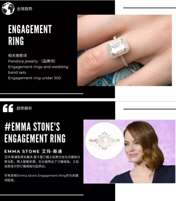 以上是我们分享的关于珠宝的子品类,其中像Emma Stone的订婚戒指,就是一款爆品,建议大家可以设置类似“Emma Stone engagement ring” 或“pearl engagement ring”等关键词。