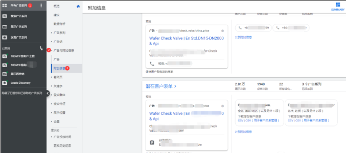 我们平常最常用的附加信息有:附加链接≥6条、附加宣传信息≥4条、附加结构化摘要≥2条、附加电话、附加潜在客户表单。详细信息可参考《谷歌推广之谷歌搜索广告实操》《谷歌广告如何直接获取客户联系方式:谷歌推广之表单广告》。
